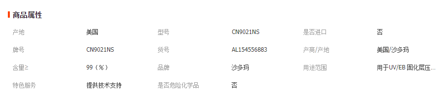 CN9021 NS丙烯酸酯產(chǎn)品描述CN9021 NS 用于UV/EB 固化層壓膠及壓敏膠配方??商峁┝己玫母街Γ犴g性及耐水性,特別對(duì)于玻璃材料。產(chǎn)品特征對(duì)玻璃附著力高伸長(zhǎng)率耐濕產(chǎn)品性質(zhì)良好的附著力良好的耐水性高伸長(zhǎng)率柔韌性好建議應(yīng)用層壓材料壓敏膠CN9021 NS 典型物理和化學(xué)性質(zhì)外觀清澈液體顏色,APHA100粘度,厘泊 @60℃